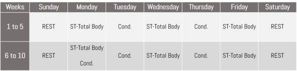 I recommend a maximum training segment duration of 8-10 weeks. Below are some example 10-week out-of-season training plans, broken down in terms of stress exposures and recovery time. I’ve laid out two traditional and three non-traditional plans for five days per week, and one non-traditional approach for seven days per week. Strength training (ST) is any weight room work. Conditioning (Cond.) would include any interval running, agility drills, or speed work.