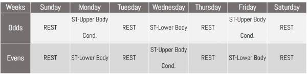 For example, the 15 upper body and 15 lower body strength sessions in the second non-traditional plan are plenty of opportunity to induce strength gains in a single out-of-season period. Also, 15 conditioning sessions are more than adequate to increase cardiorespiratory fitness. Note that 40 complete rest days are scheduled here to facilitate recovery from the 30 actual training days, making this a sound training plan.
