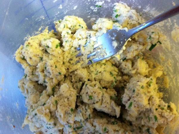 I decided to substitute the milk and sour cream with 2% greek yogurt, upped the cheese to a “rounded” half cup (mostly because I shredded too much), and upped the chives to just under a quarter cup. I began mixing and decided it was still slightly too dry to pull the dough together, so I added two tablespoons of soy milk. And it totally worked!